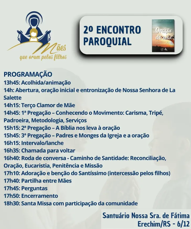 O Grupo de Mães que Oram pelos Filhos completa dois anos de atuação em Erechim e realiza, no sábado, dia 6 de dezembro, o seu segundo Encontro Paroquial. A programação inicia às 14h, no Santuário Nossa Senhora de Fátima, e é aberta à comunidade. O convite se estende a todas que se identificam com a maternidade em suas muitas formas: mães, avós, tias, madrinhas, gestantes, tentantes, mães de coração e mães de anjos.