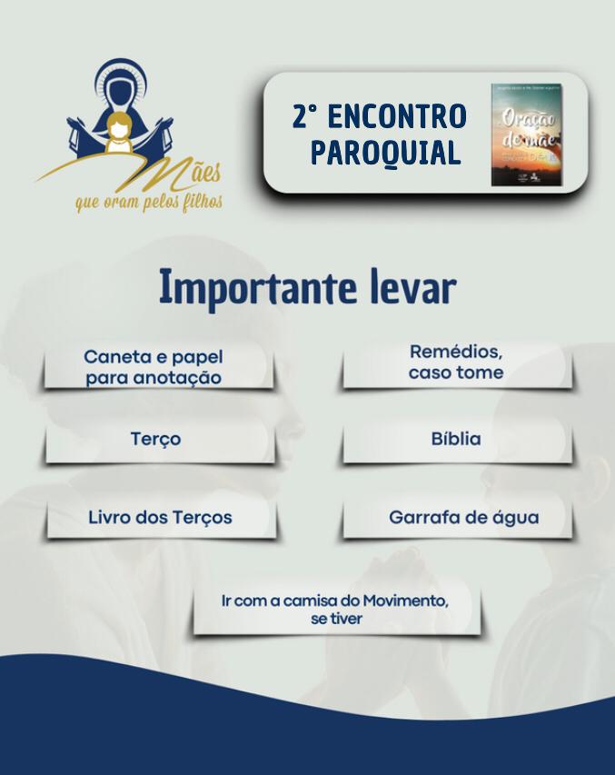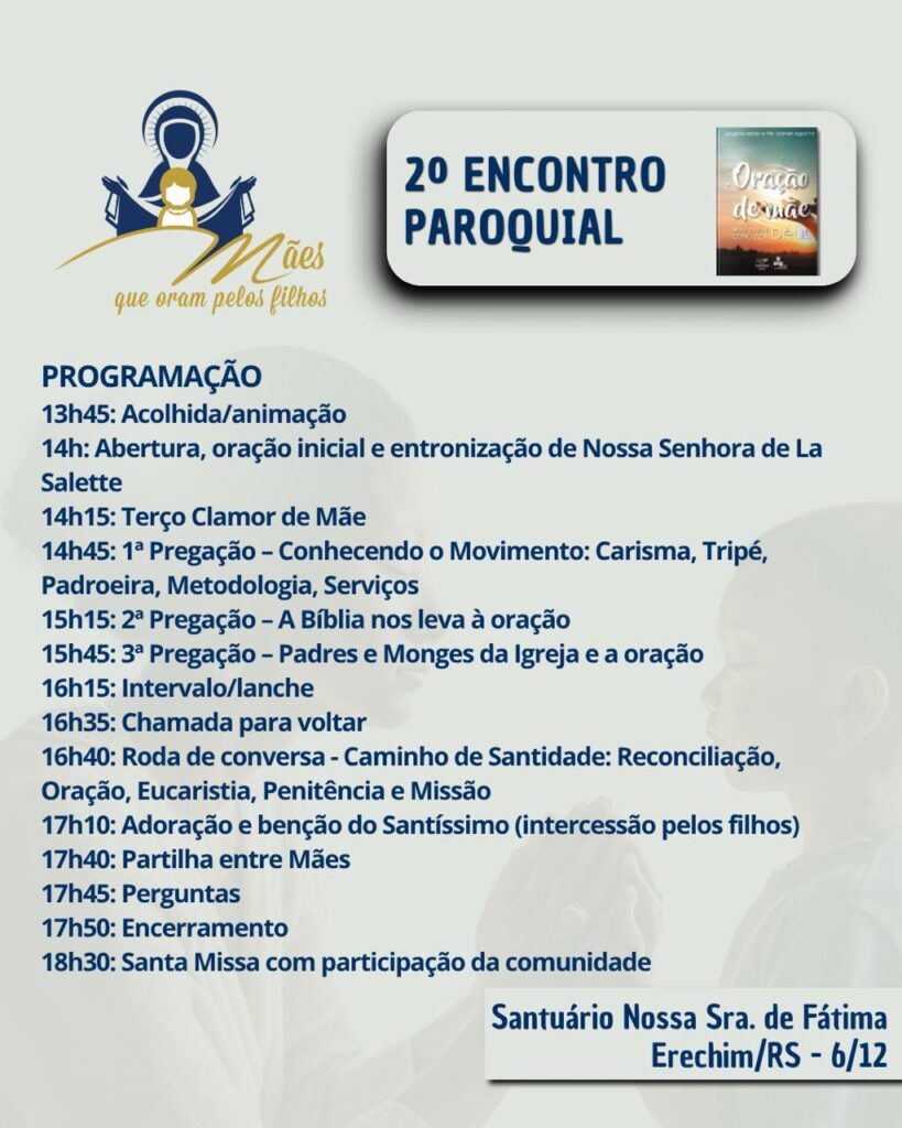E é com imensa alegria que convida toda a comunidade, em especial mães, tias, dindas, avós, mães de coração, mães de anjos, gestantes, tentantes, e todas que sentem a maternidade pulsar em seu coração de alguma forma a participarem do 2º ENCONTRO PAROQUIAL, que acontecerá no dia 06/12. Será a partir das 14h, no Santuário N. Sra. de Fátima.