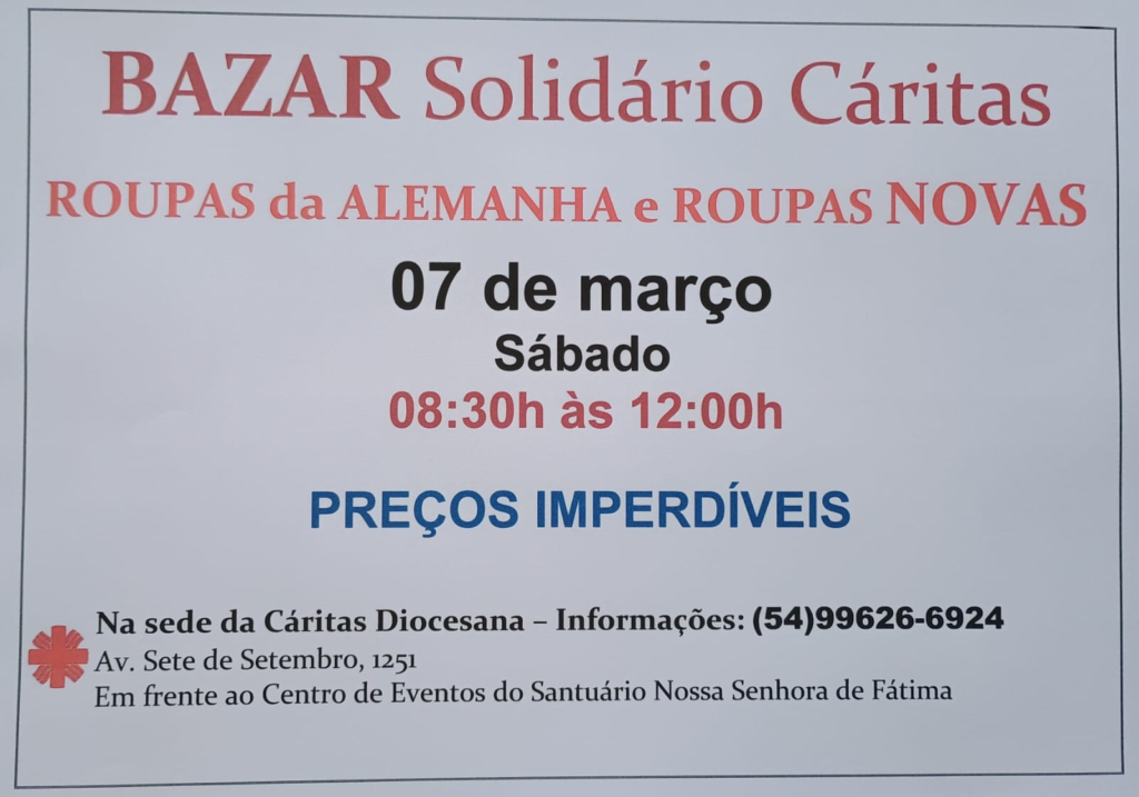 A Cáritas Diocesana promove neste sábado, 7 de março, mais uma edição do Bazar Solidário, com roupas da Alemanha e roupas novas. O bazar funcionará das 8h30 às 12h, na sede da entidade, localizada em frente ao Centro de Eventos do Santuário Nossa Senhora de Fátima, em Erechim. O bazar é aberto à comunidade e tem como objetivo colaborar com as iniciativas sociais desenvolvidas pela instituição.