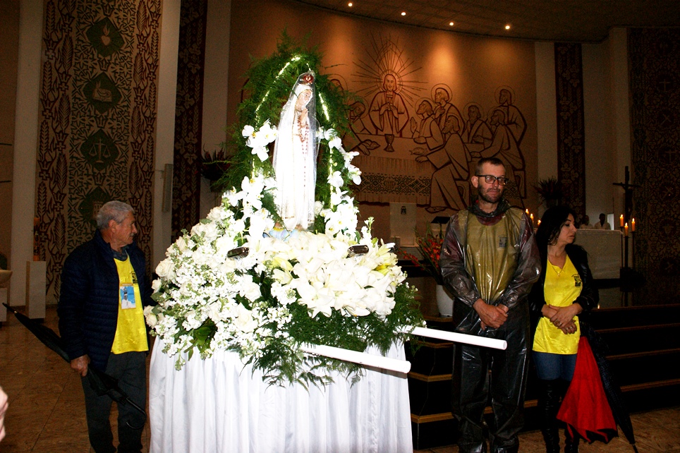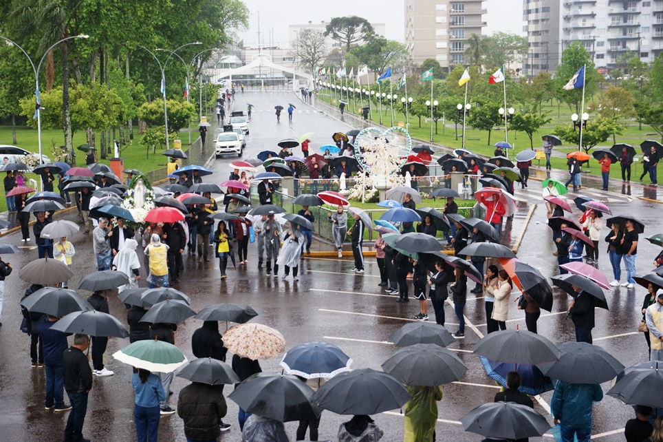 Em vista da chuva persistente, a Sagrada Comunhão Eucarística foi servida apenas dentro do Santuário.