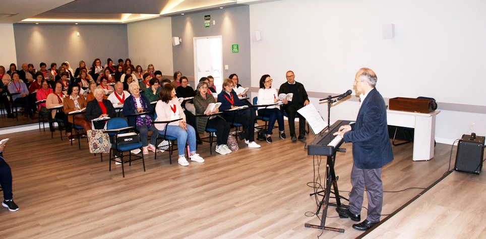 Na parte da manhã, Pe. Sala conduziu momentos de reflexão e de oração, alternados com cantos sobre a esperança no contexto do Jubileu 2025 “Peregrinos de esperança”, a ser concluído, nas Dioceses, no dia 28 de dezembro próximo, festa da Sagrada Família, com a competência, a habilidade e o ardor musical que o caracterizam,