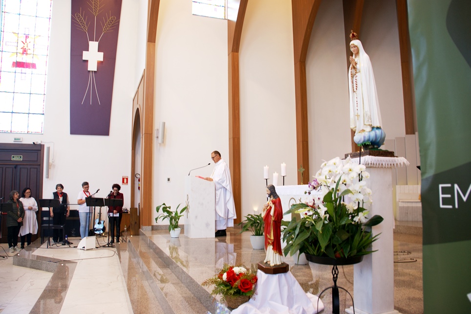 A partir das 13h, os participantes do retiro se reuniram no Santuário para a Adoração ao Santíssimo Sacramento e para a celebração eucarística, sob a presidência do Pe. Sala e a concelebração do Pe. Gladir.