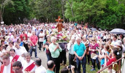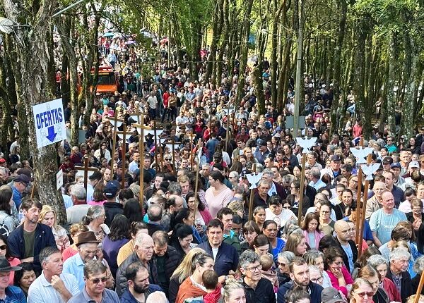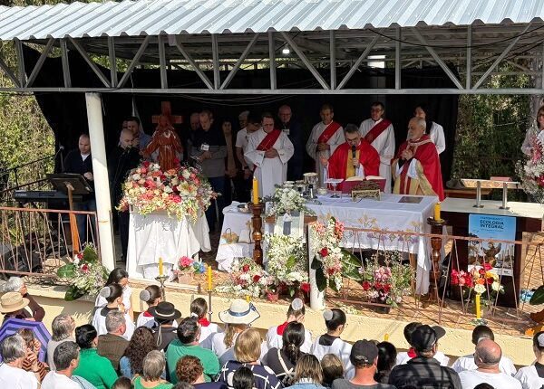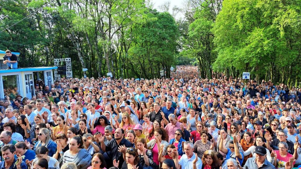 Lembrou alguns aspectos históricos da devoção a N. Sra. da Santa Cruz ligada à senhora Dorothéa Menegon Farina, cujo esposo e filhos residiam naquela localidade, que se tornou local de peregrinação, oração e devoção. Ela faleceu aos 29 de maio de 1988. Em 14 de setembro daquele ano, foi realizada a primeira romaria e em 5 de maio do ano seguinte foi iniciada a construção do santuário. Por decreto do bispo, o santuário teve sua ereção canônica (oficialização) com estatuto próprio. Assim, no território da Diocese são 3 os santuários devidamente erigidos: Nossa Senhora da Salete de Marcelino Ramos, Nossa Senhora de Fátima de Erechim e o daqui. Três locais de intensas peregrinações e celebrações dos sacramentos da Eucaristia, Reconciliação e Unção dos Enfermos. Monsenhor Agostinho prosseguiu ressaltando que a romaria se realiza sempre no dia 14 de setembro, festa da Exalação da Santa Cruz. Referiu-se à natureza do mistério da Cruz do Cristo Redentor, do qual sua e nossa Mãe participou profundamente, permanecendo firme junto a seu Filho crucificado. Observou que a Cruz não é vista como símbolo de sofrimento, mas de redenção. É o trono sagrado de Cristo. Dela brota a vida nova. O presidente da celebração destacou as cruzes do nosso tempo, as dores e os sofrimentos de tantos irmãos e irmãs: doença, injustiça, desprezo, ódio, vingança, violência, discriminação, fome, divisões, guerras, falta de amor, brigas familiares e tantas outras…. Cristo veio ao encontro da humanidade sofredora com supremo amor. Monsenhor desejou que Maria ajude a todos a carregar as próprias cruzes e a nunca desanimar, alimentando a esperança de peregrinos. Referiu-se às leituras e ao evangelho da celebração. Citou algumas recomendações da senhora Dorothéa: cultivar a união com a Igreja, a devoção ao Santíssimo Sacramento e procurar a confissão; formar crianças e jovens na fé e na participação na igreja; rezar o terço e consagrar as famílias, receber a comunhão. Suas mensagens enfatizam a paz, a oração contínua, a renovação da fé, a vida comunitária, a frequência aos sacramentos, ao cuidado e atenção com a família. Monsenhor, lembrando o Ano Jubilar e o Mês da Bíblia, concluiu exortando a todos a ser Igreja sinodal, de comunhão, participação e missão, a buscar a reconciliação, construindo laços de fraternidade e comunhão, vivendo a caridade, o serviço, a gratidão, alimentando a fé para serem peregrinos de uma Esperança que não decepciona: Jesus Cristo!