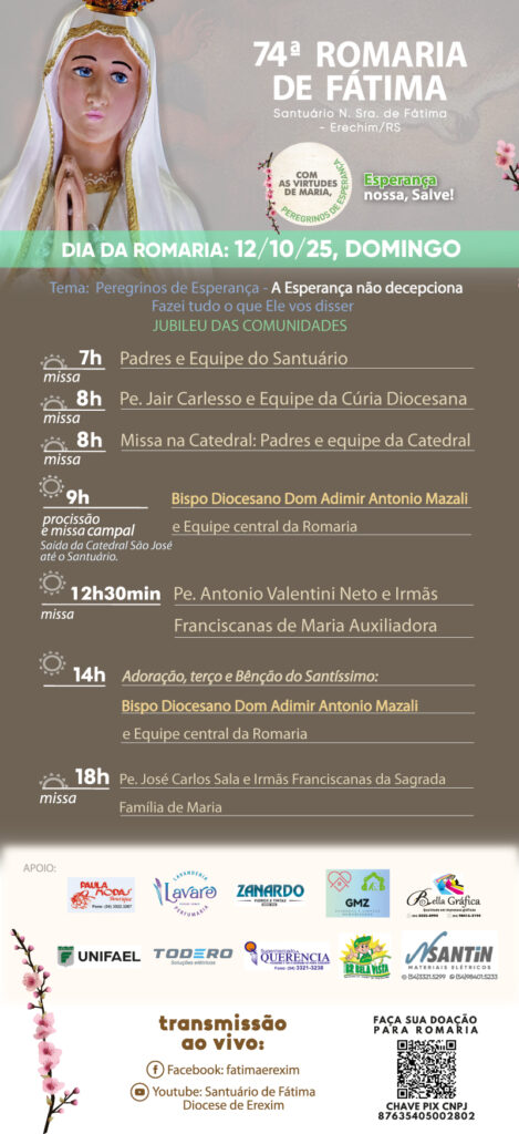 No ano jubilar “Peregrinos de Esperança”, no Mês Missionário, a Diocese de Erexim vive neste segundo domingo, dia 12 de outubro, solenidade da Bem-Aventurada Virgem Maria da Conceição Aparecida, sua 74ª Romaria de N. Sra. de Fátima, evento anual de 10 dias de oração, peregrinação, renovação da fé, do seguimento a Cristo, do amor à Igreja Católica.